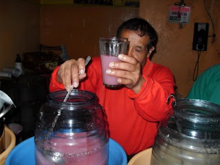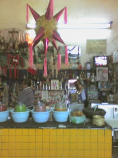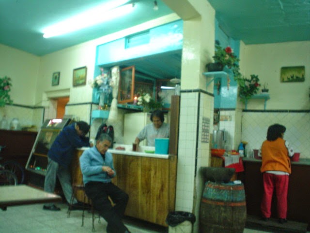 Entro, lo primero que veo es un barril ya viejo pintado de azul con los aros rojos, muy parecido al que hay en La Pirata, miro detenidamente el espacio, amplio, todo lleno de azulejos, de piso a techo, muchas repisas en todas las paredes, dos altares a la virgen con flores frescas, uno sobre el mostrador y otro cerca de la rockola, no huele mal,en la barra que se encuentra en un rincón esta un señor no muy viejo, pero con ojos cansados, tez muy quemada por el sol, una camisa azul claro con las infaltables cadenas de fuera me saluda con la mirada y me dice "¿de que va ser?" cuento mi presupuesto y veo que el litro de blanco esta en $10, tardo en contestar pero al final digo "un blanco, por favor" me lo sirve en los clásicos vasos de botella recortada, volteo hacia la entrada unas ollas enormes de barro están empotradas a la pared, otra repisa con aceite, sal, harina, huevos, frijoles y carbonato, mas allá, una parrilla donde burbujea algo, el encargado me dice "estamos haciendo chilaquiles, ya en un rato están" pruebo el pulque, sabe ácido, muy rico, me tomo un gran sorbo por la sed y el calor, veo que el piso esta carcomido, años de uso y abuso seguramente, entra mucha luz por unos vitrales en lo que creo fue el departamento de mujeres, por fuera se ve pequeña, por dentro todo parece mas grande.